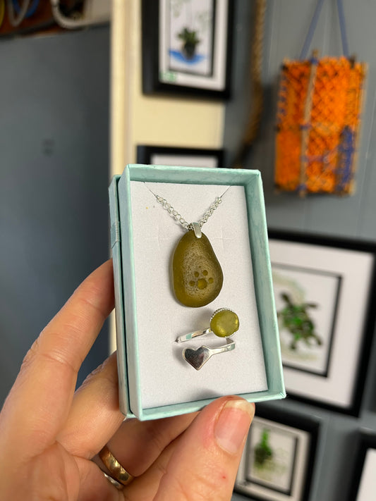 Whitby Sea Glass pendant with matching ring on gold-plated (Olive)