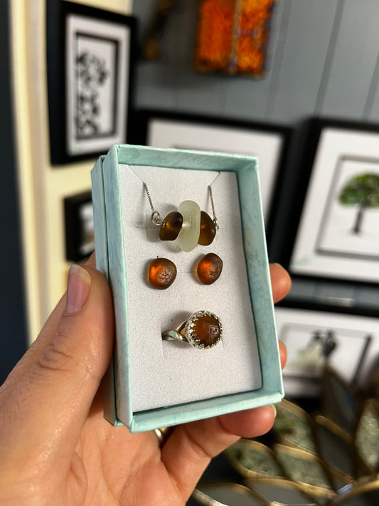Whitby Sea Glass necklace on silver, with matching studs and ring (Brown with White)