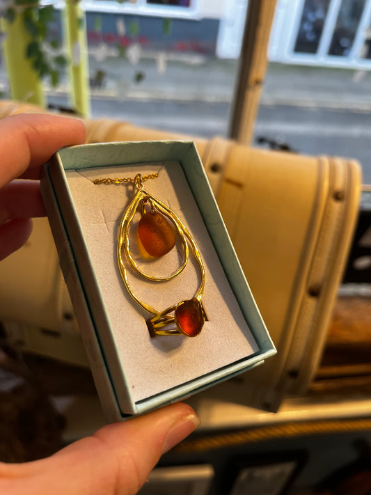 Whitby Sea Glass on gold-plated ripple pendant with matching ring (Burnt Umber)