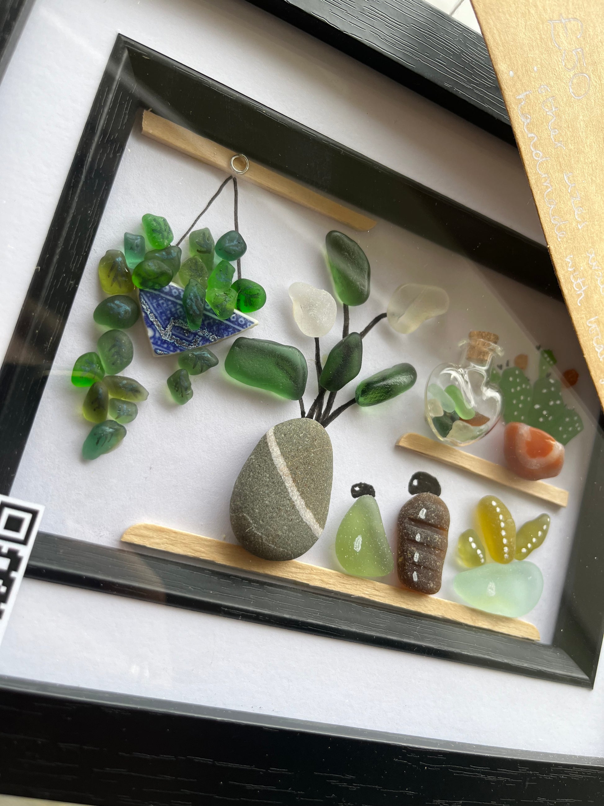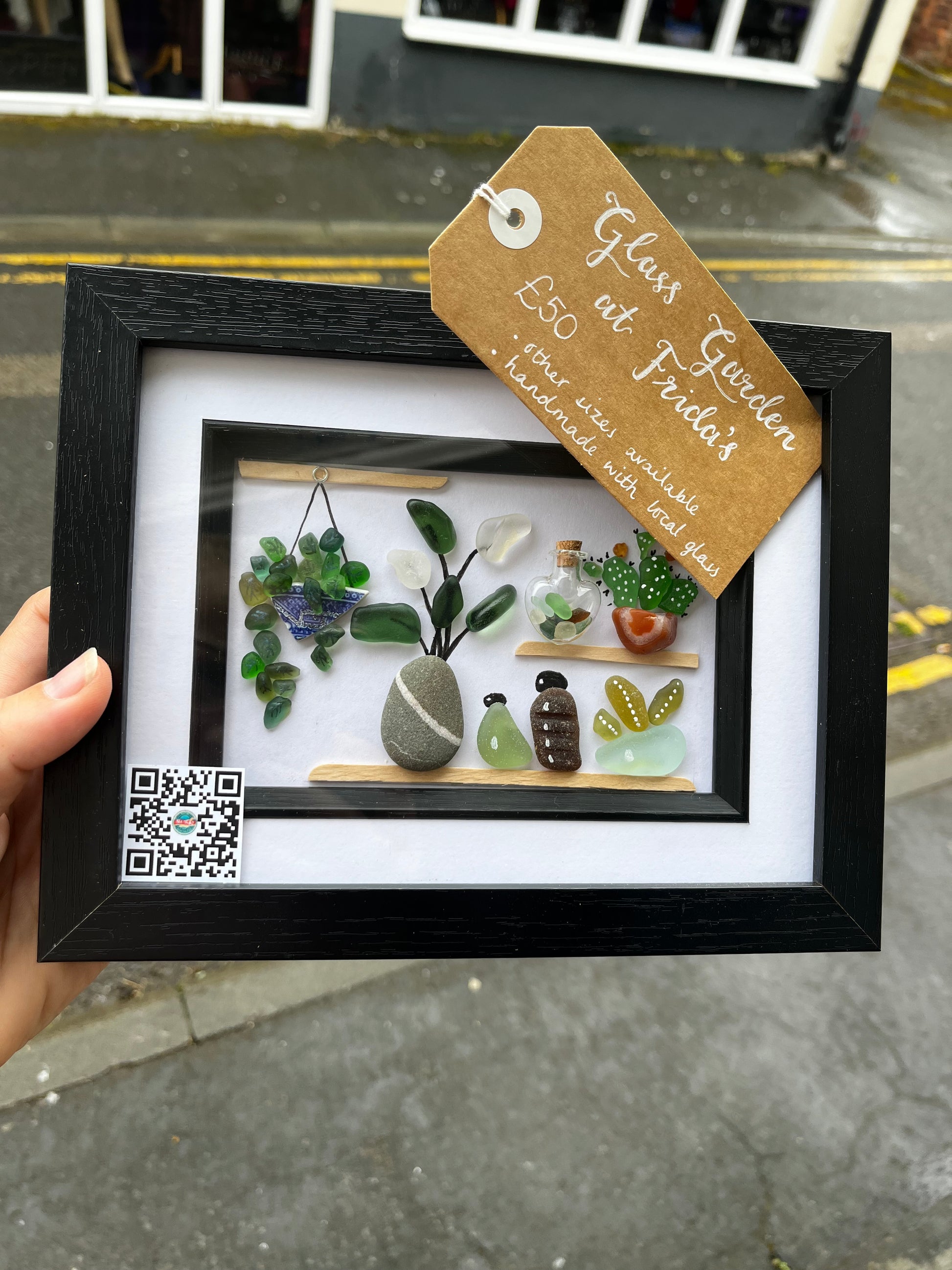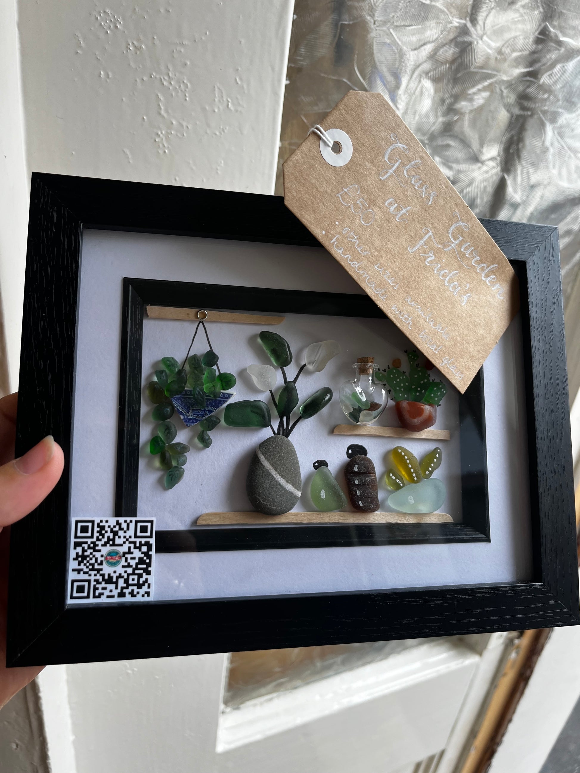 This beautiful “glass garden” has been hand-made, in Whitby, with local, hand-picked sea glass. It is currently residing at Frida’s Cottage, Whitby.