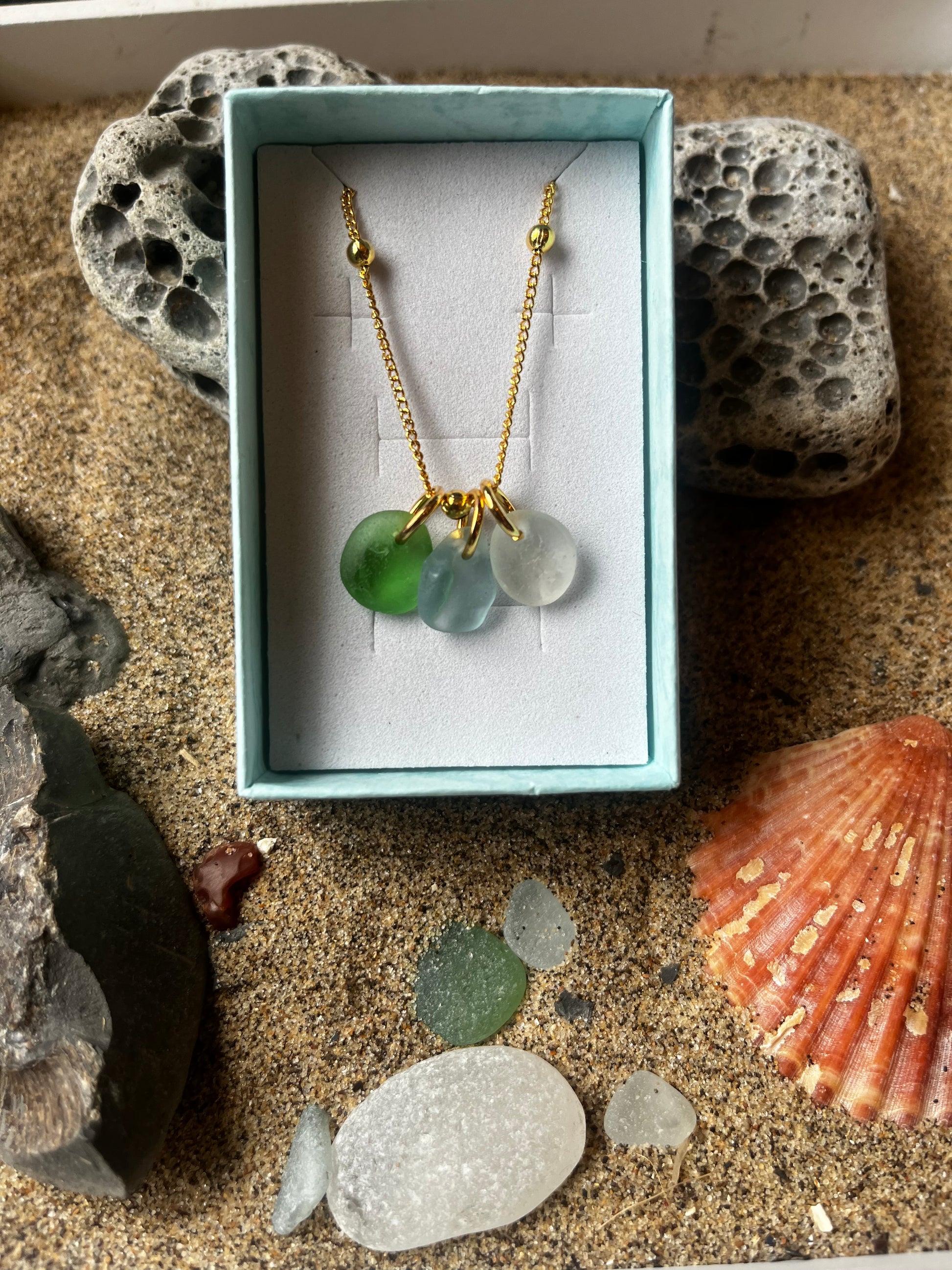 18 inch Gold-plated satellite necklace with hand-picked Whitby sea glass charms.