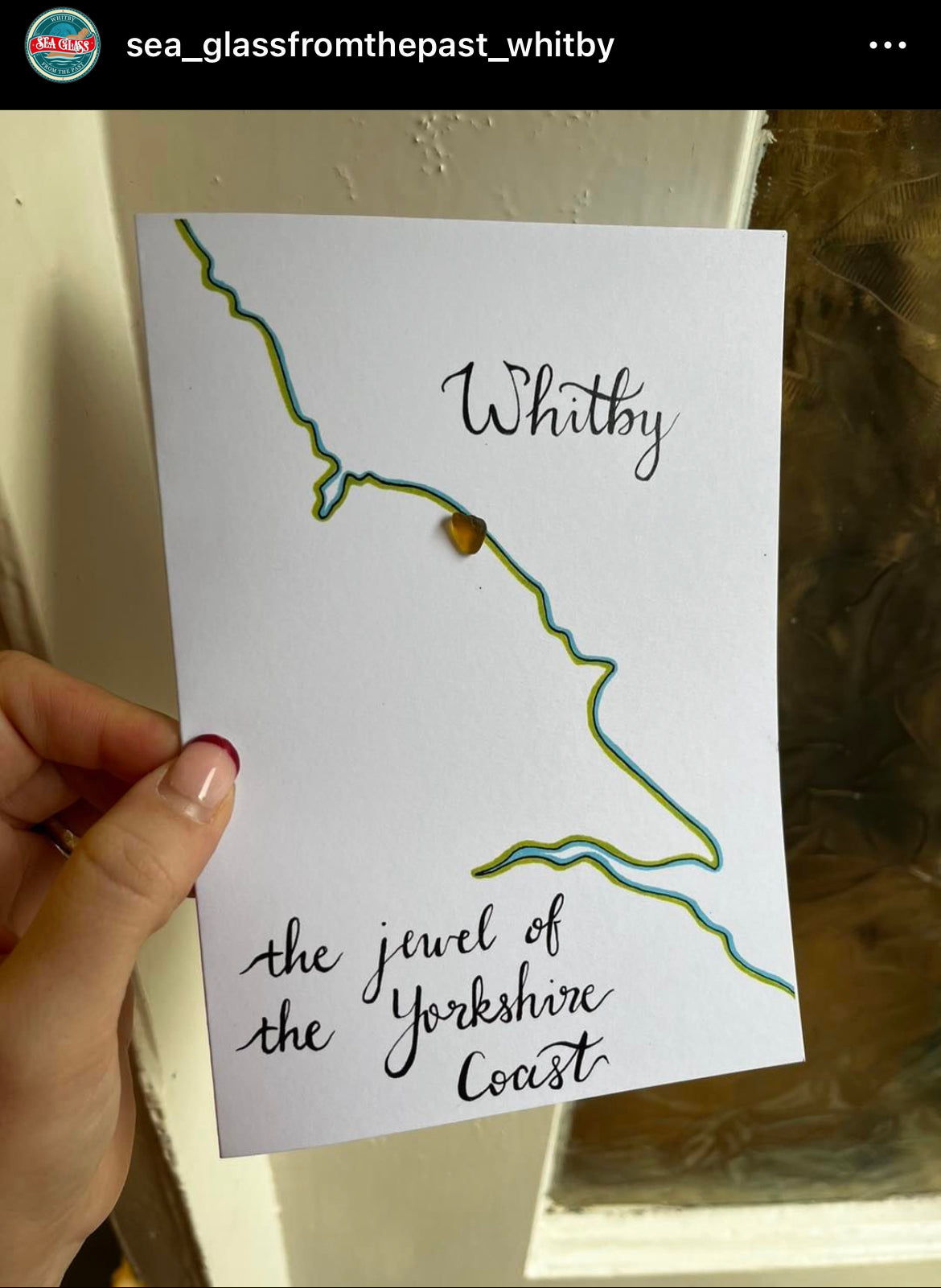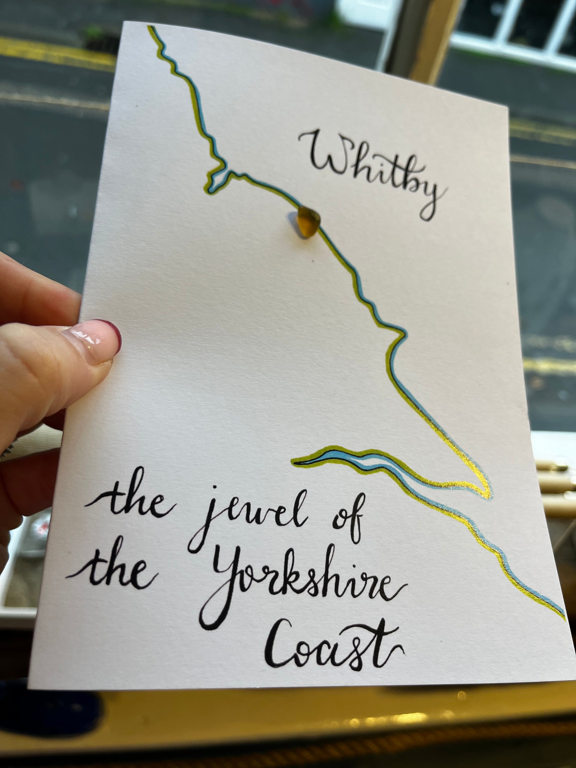 These cards are printed from a hand-drawn design and decorated with a piece of hand-picked Whitby sea glass.