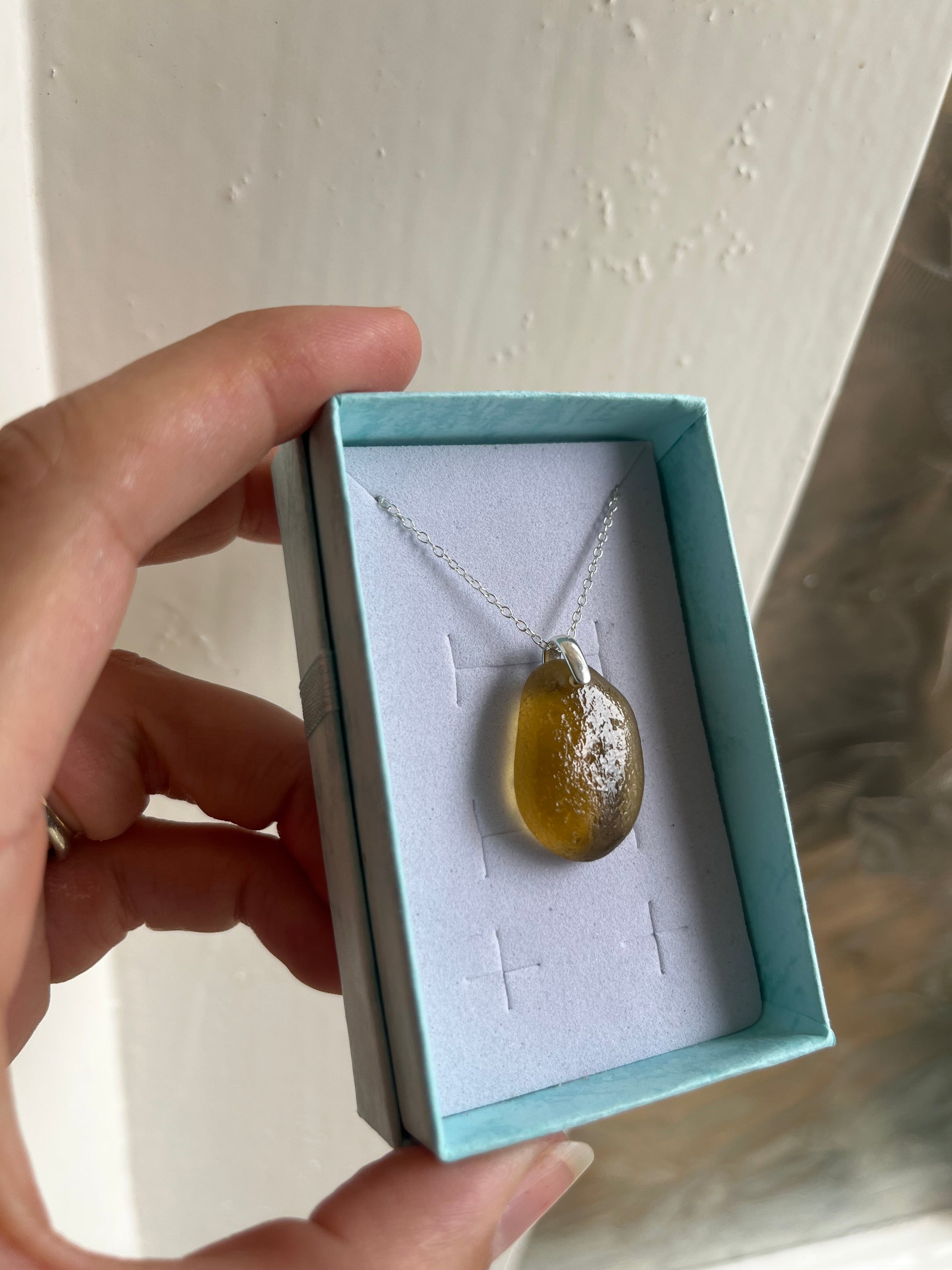 Handpicked Whitby sea glass; on an 18” silver chain with subtle silver bail